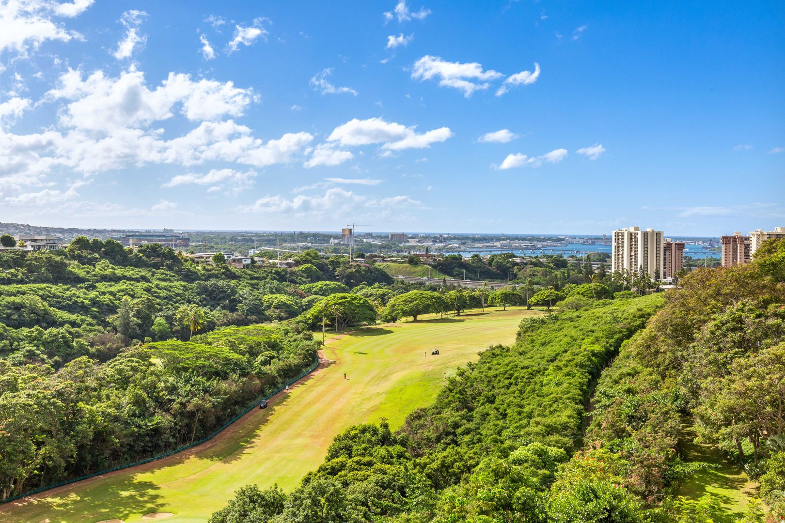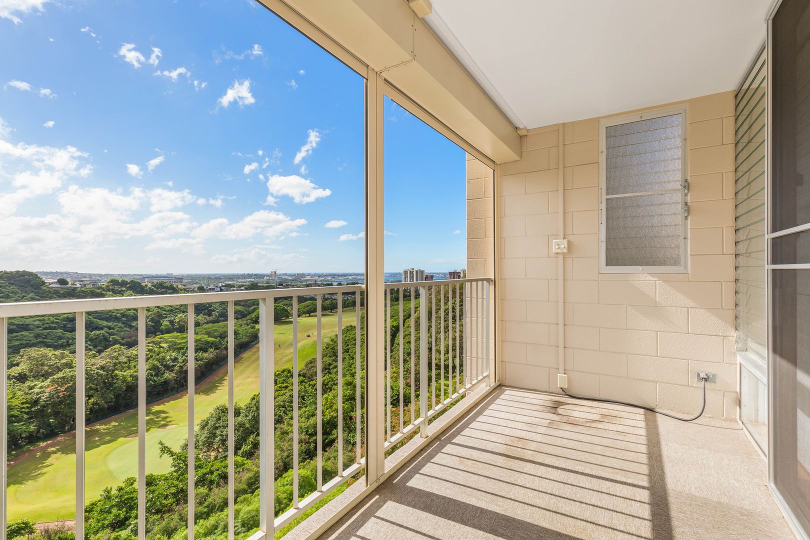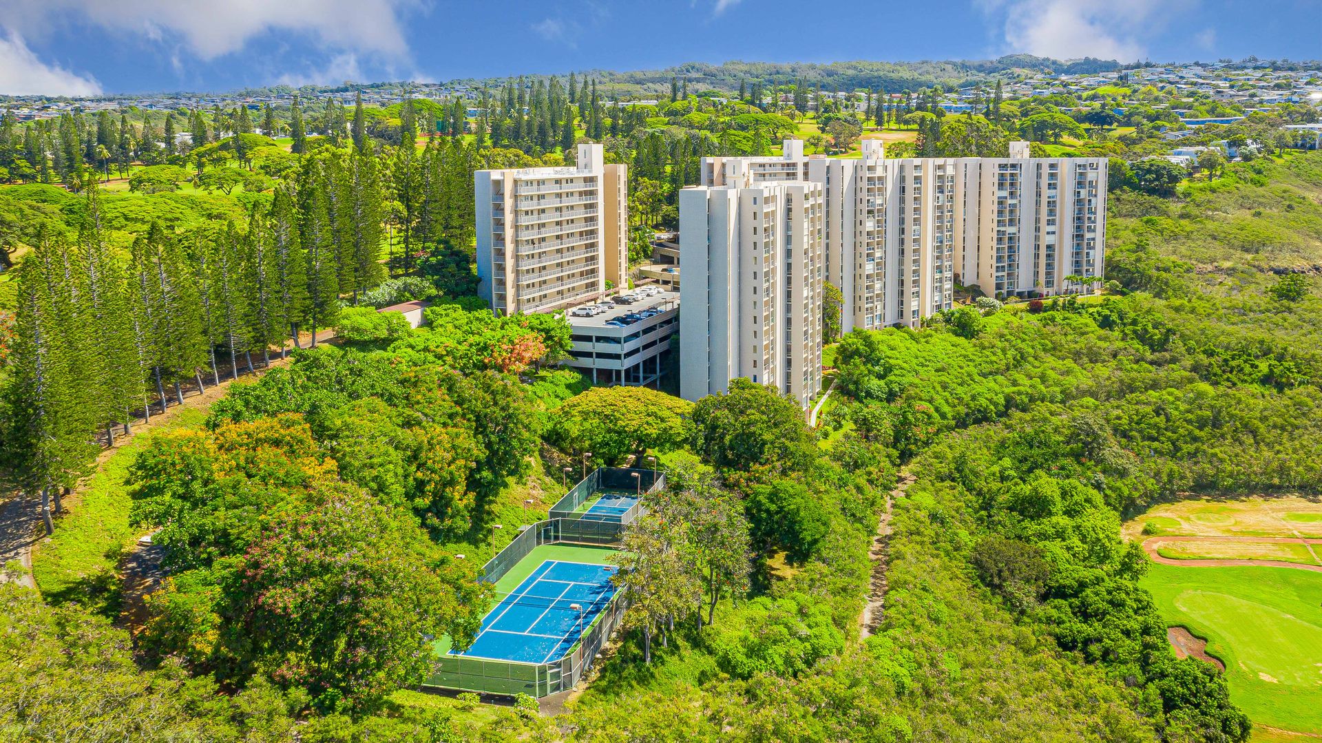 Meticulously maintained end unit with many upgrades. Largest of the single-level 2-bedroom, 2-bath unit with includes a bonus area. Situated on the 5th floor, actually 8 floors up, it offers stunning views overlooking the golf course to Pearl Harbor to the ocean. Turn toward the mountains for sunrise colors and afternoon rainbows. The lanai accommodates a table and chairs to enjoy the beauty. The remodeled kitchen is open to the view, bringing in natural light. Both bathrooms are fully remodeled and feature beautiful, oversized shower stalls. The primary bedroom boasts two large closets, a private bath, and windows on either side for a cooling cross breeze. The ample second bedroom also enjoys fantastic views. Includes full-sized washer/dryer, one assigned covered parking stall, Friedrich a/c units (nearly new) in the living room and primary bedroom. Rent includes cable, internet, hot water, sewer, and trash. The gated community offers endless amenities: heated pool, whirlpool, tennis, recreation room with pool and ping pong, pickleball, BBQs, exercise rooms, saunas, EV charging, putting green, guest parking, and more! Truly resort style living!